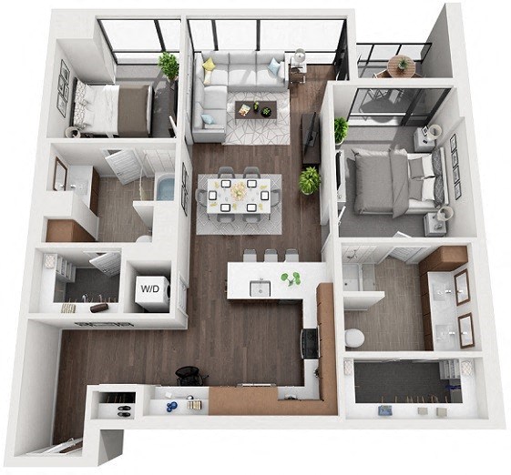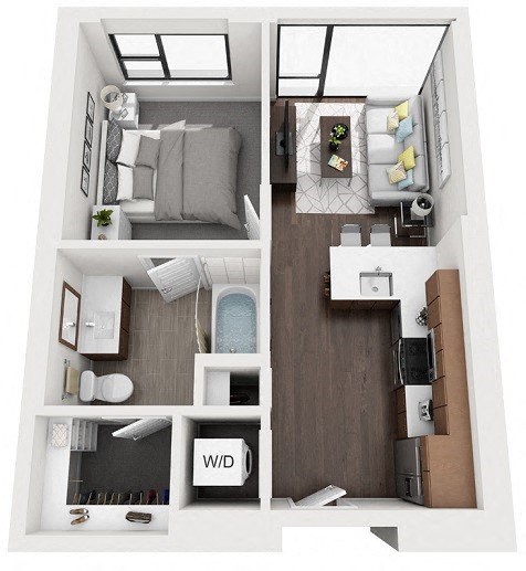 1000 Speer by Windsor offers a variety of studio, one-, two-, and three-bedroom luxury apartments designed to meet your lifestyle needs. Personalize your home with a choice of three elegant finishes—espresso, walnut, or white—creating a space that reflects your style. Oversized windows fill each residence with natural light, while soaring 10- to 12-foot ceilings enhance the sense of spaciousness and sophistication.