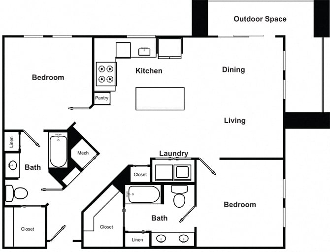 Windsor Encore offers a variety of open-concept floorplans, each thoughtfully designed for modern living. One-bedroom layouts range from 610 to 885 square feet, while two-bedroom residences start at 1,085 square feet. Our most expansive three-bedroom floorplans span 1,597 square feet and feature three bathrooms for ultimate comfort.